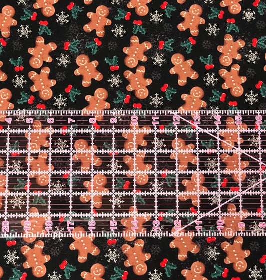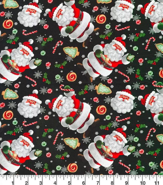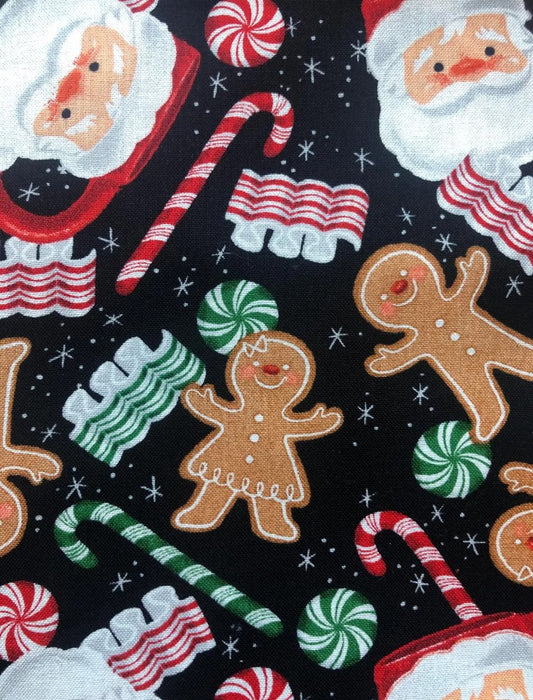 Christmas Santa and Gingerbread on Black 100% Cotton Price per Yard
