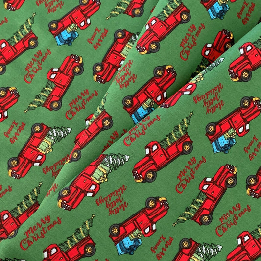 Christmas Red Truck Gifts Trees on Green 100% Cotton Fabric