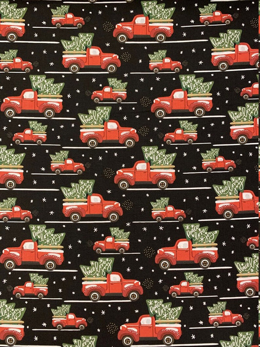 Christmas Peace Love Joy in Vintage Red Truck on Black 100% Cotton Fabric Price Per Yard