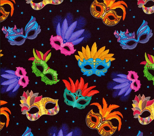 Mardi Gras masks on Black 100% Cotton Digital All Over Print