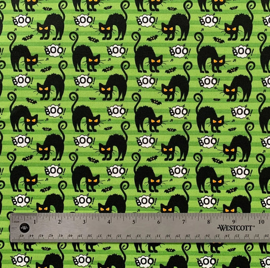 Halloween Black Cats BOO and Bats on Striped Green 100% Cotton Fabric
