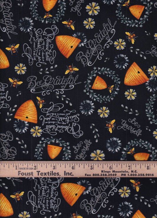 Hi Fashion Bee Hives And Phrases On Black Novelty 100% Cotton Price per Yard