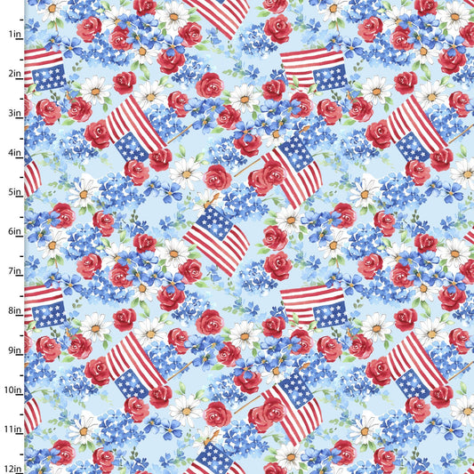 3 Wishes Fabric Patriotic Victory Floral and Flags on Light Blue Price per Yard