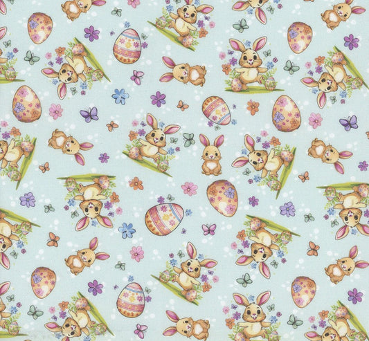 Mook Fabrics Hoppy Easter Bunnies Aqua 100% Cotton Price per Yard