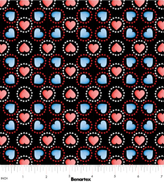 Benartex Patriotic Circle Hearts Red Blue Black 100% Cotton Price per Yard Valentine
