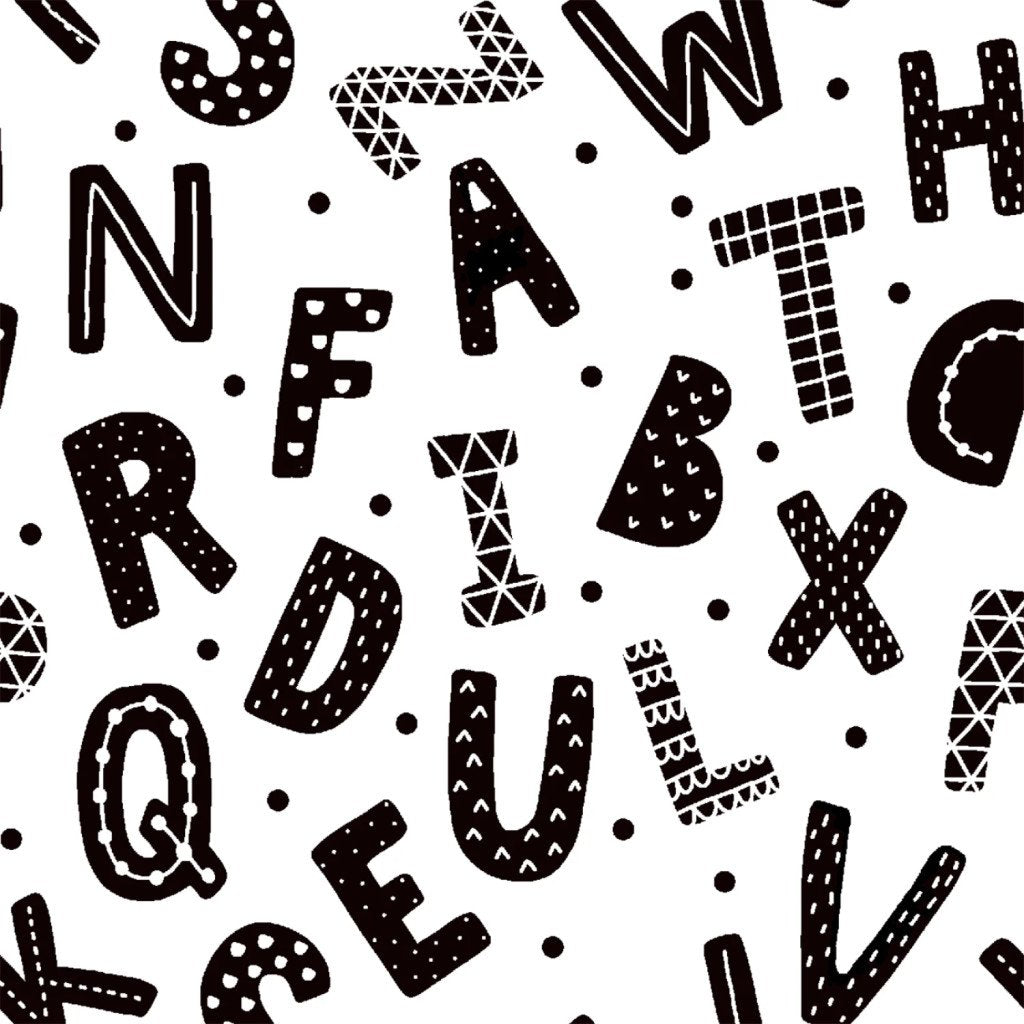 This delightful fabric features a playful design of various black letters scattered across a crisp white background, creating a fun and educational pattern perfect for children's projects or creative home decor. The letters are designed in a variety of styles, adding a dynamic visual appeal that can inspire both learning and creativity in any setting.