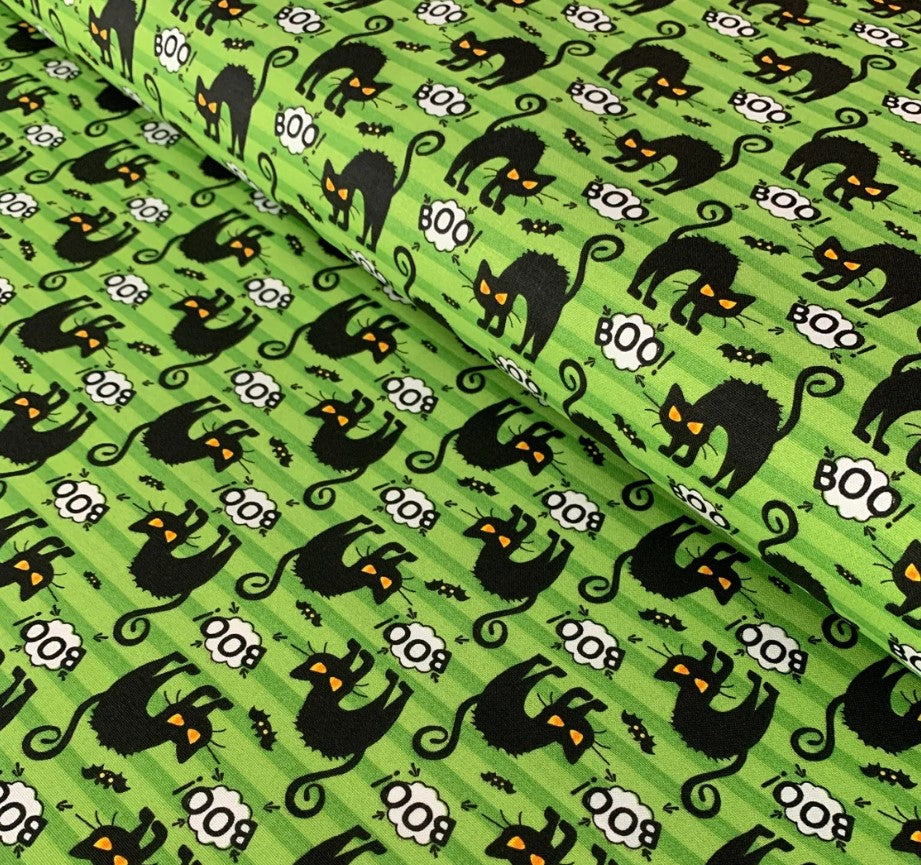Halloween Black Cats BOO and Bats on Striped Green 100% Cotton Fabric
