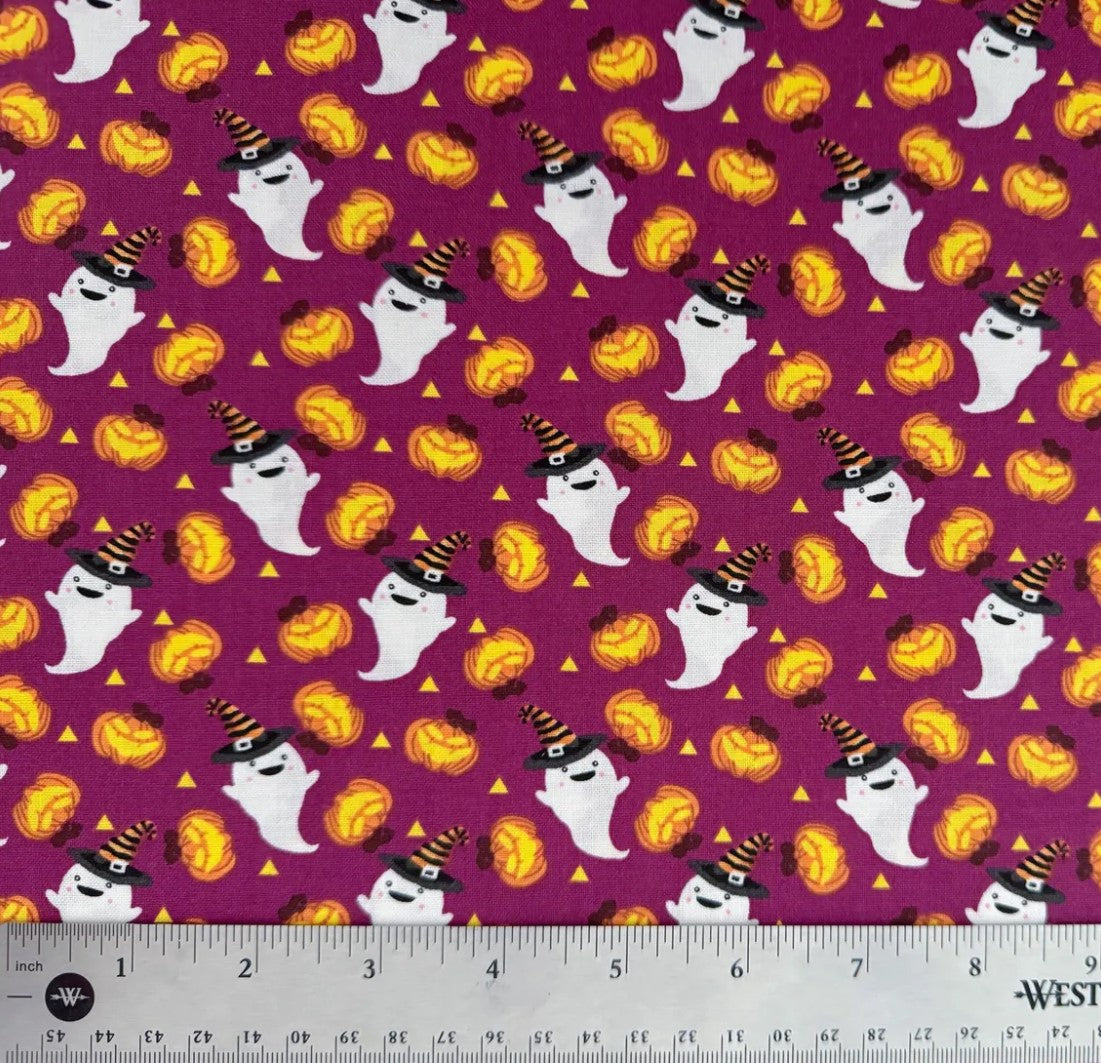 This Halloween Fabric is perfect for your spooky season projects! It features happy ghosts wearing witch hats and pumpkins on a purple background. The fabric is 100% cotton and measures 45' x 36'.