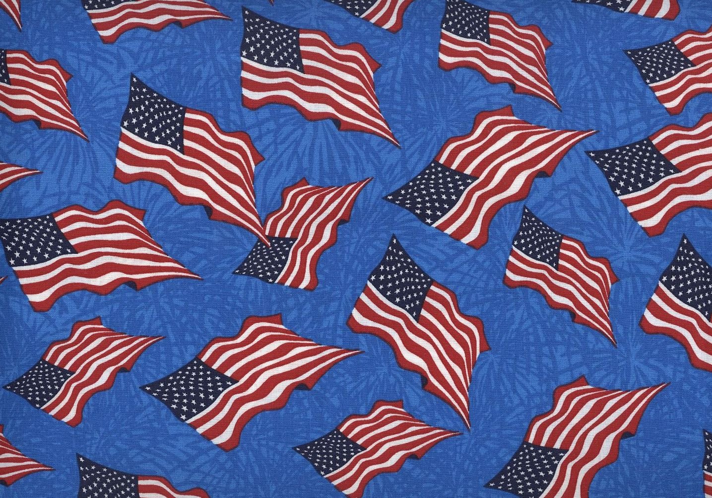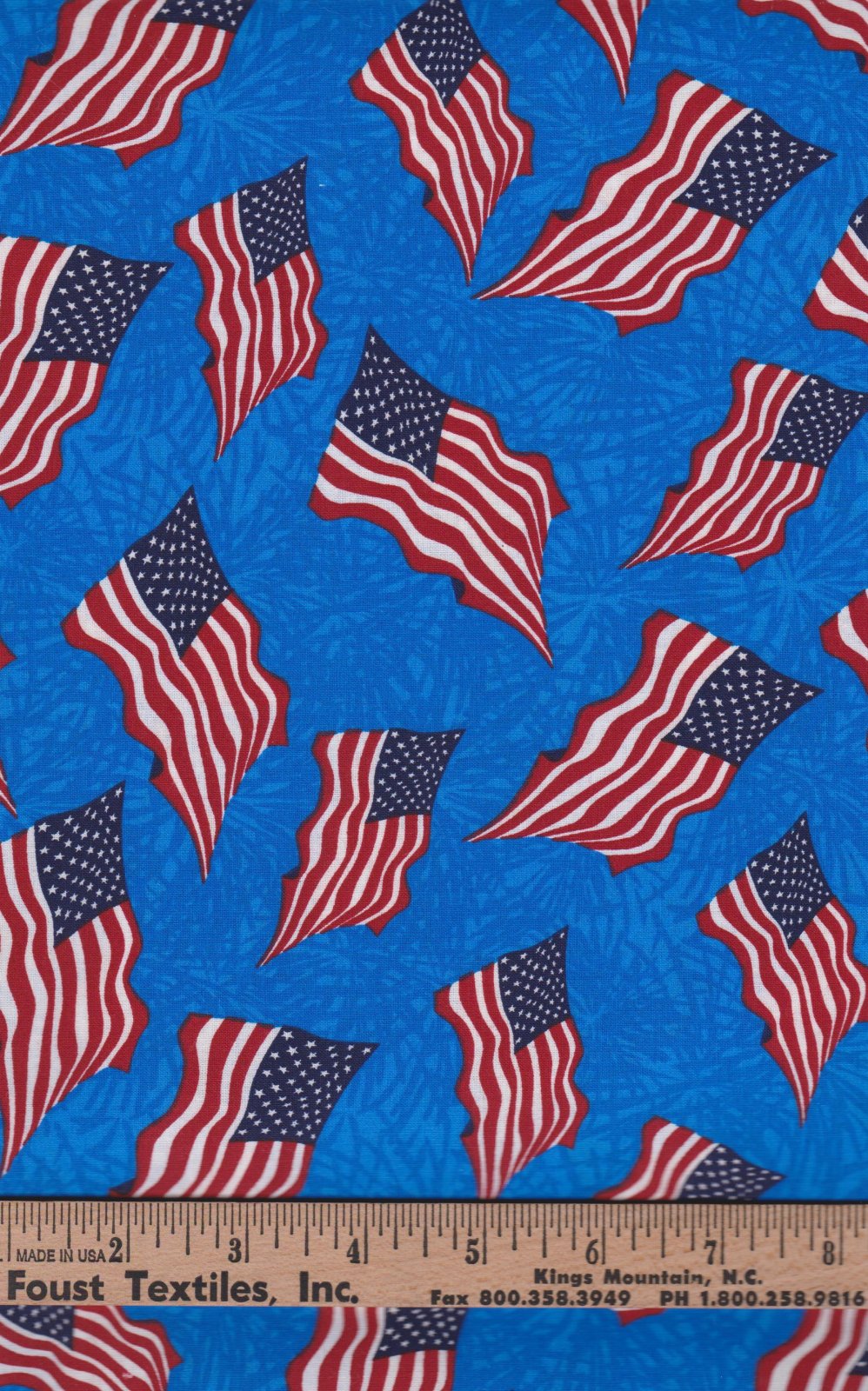 Foust Textiles Made In The USA Red White and Blue Wavy Flags on Blue Patriotic Price per Yard