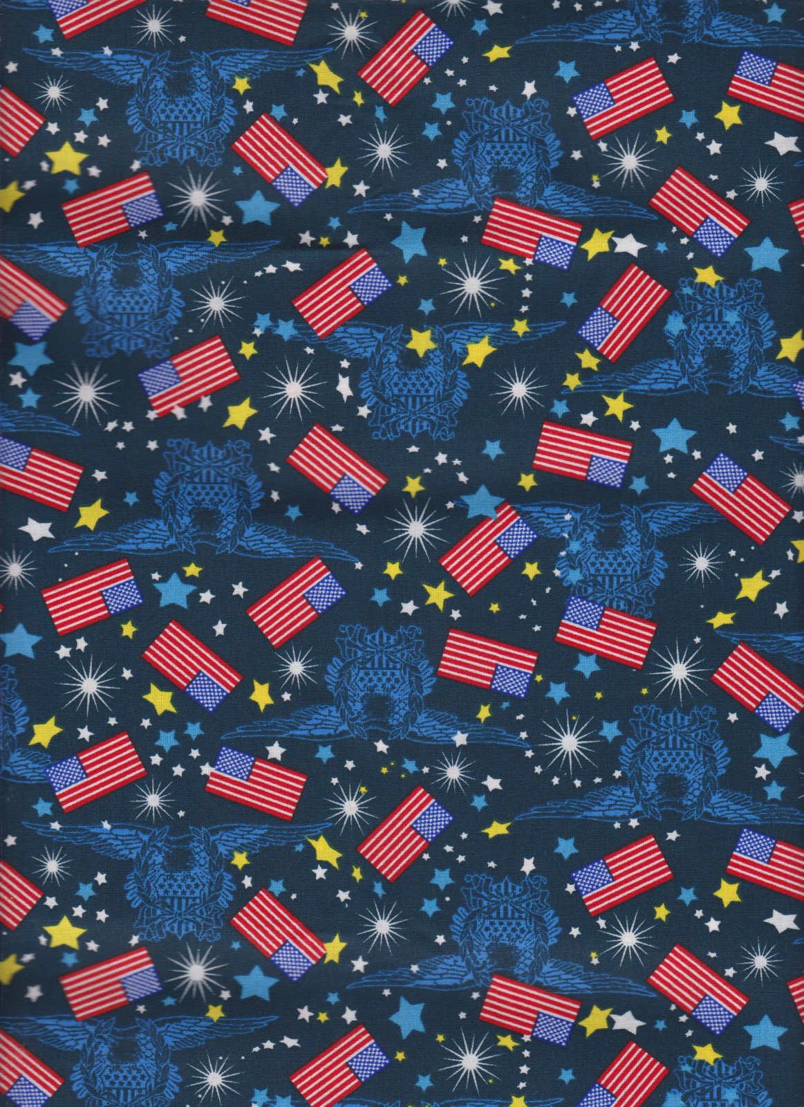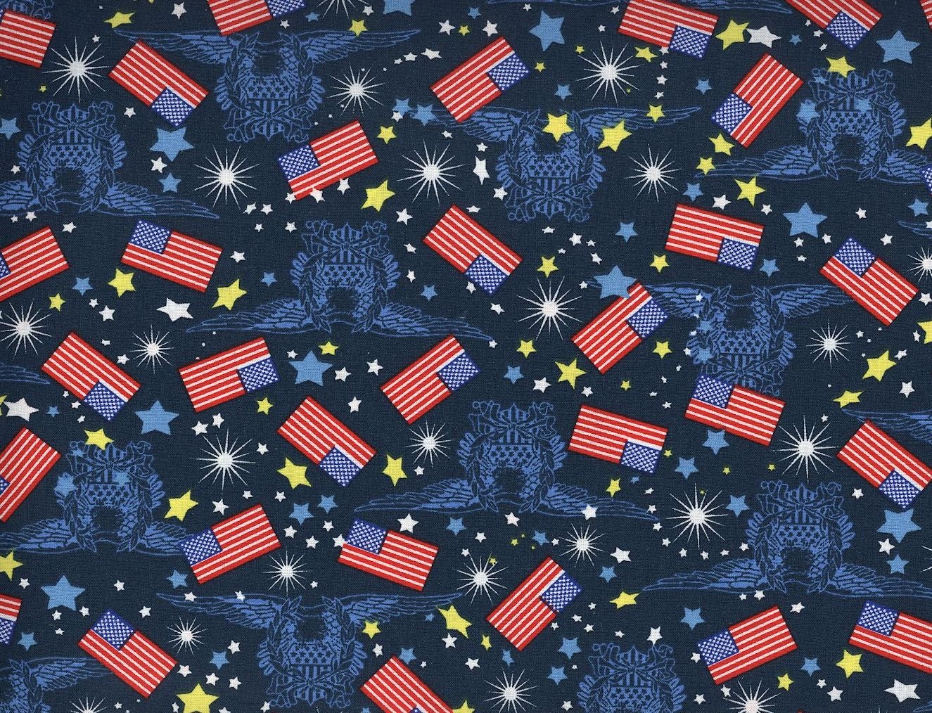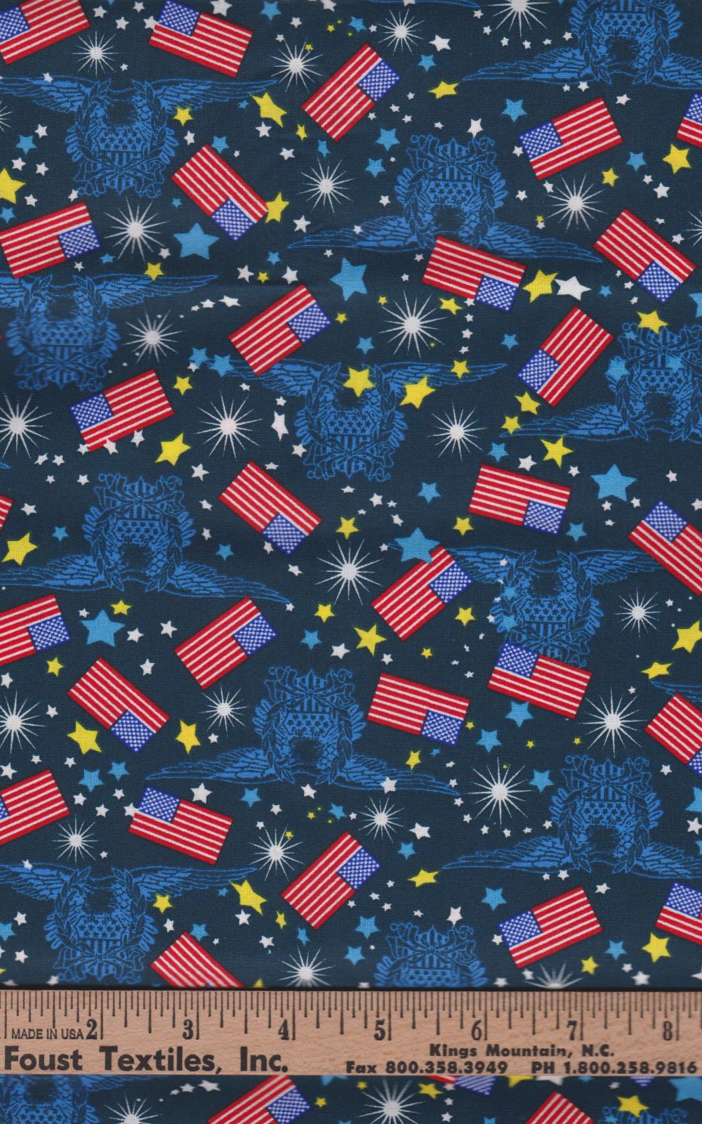 Foust Textiles Made In The USA Red White and Blue Wavy Mini Flags and Eagle Emblems Patriotic Price per Yard