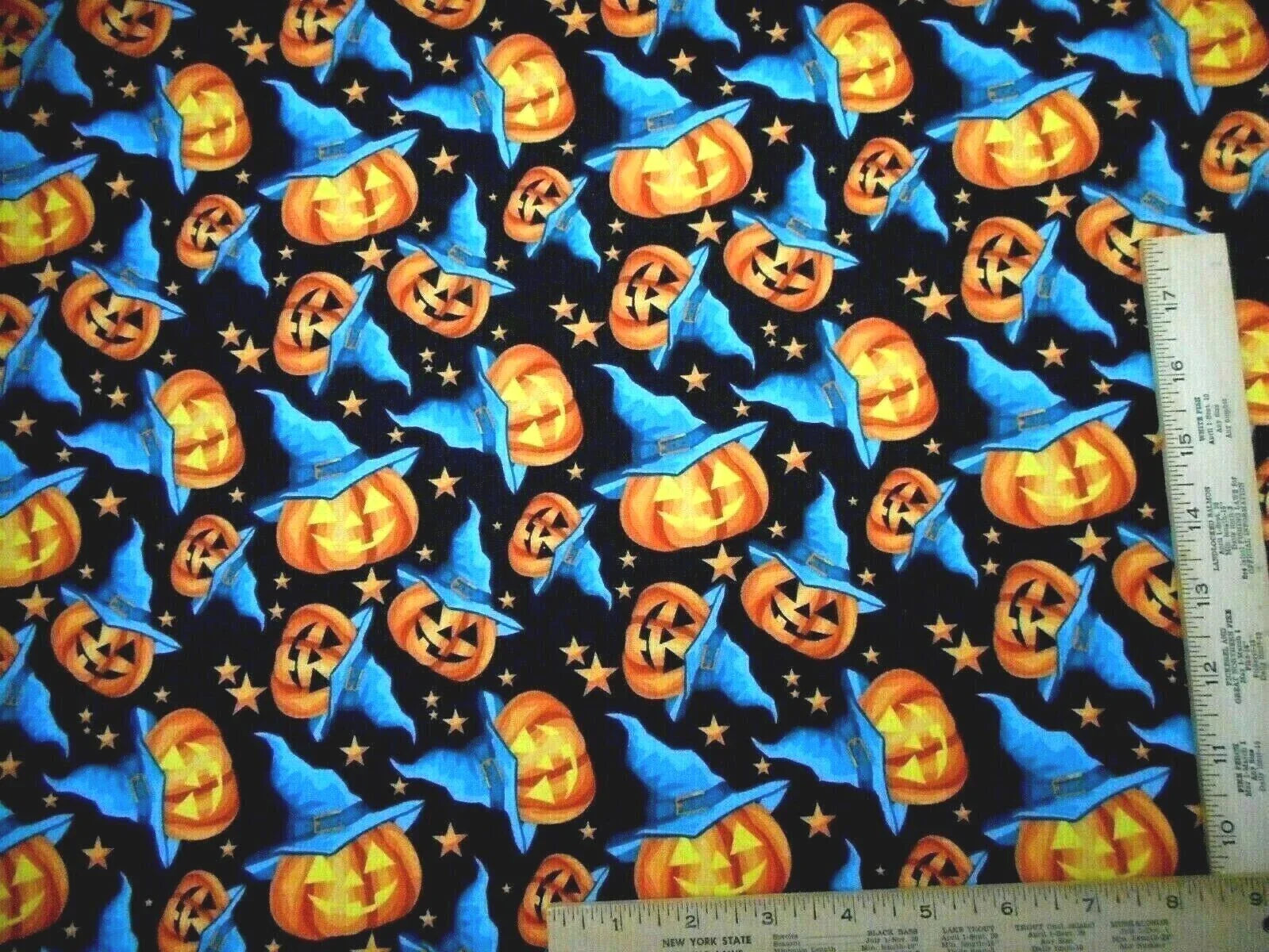 This Halloween Fabric Smiling Pumpkins Jack o Lantern with Stars on Black by the yard is perfect for your seasonal crafting needs. The fabric is 100% cotton and measures 45 inches wide. The design features a smiling pumpkin jack o lantern on a black background.