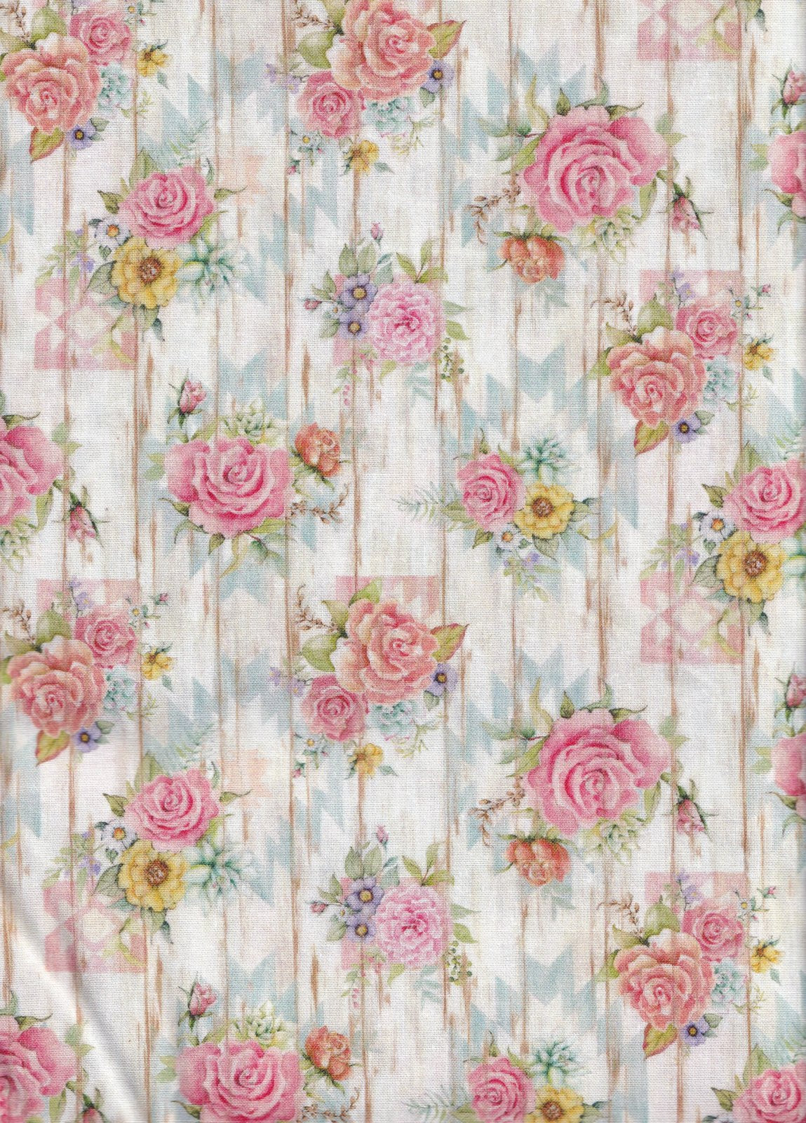 Immerse yourself in the charming allure of this pastel floral prints fabric, featuring an array of blooming roses in soft shades of pink, peach, and yellow, highland cows in a field, western boots and a rustic wood plank background with subtle chevron patterns. The distressed shiplap-inspired design evokes a cozy highland ranch vibe, blending vintage country elegance with modern whimsy, making it perfect for crafting heartfelt quilts, throw pillows, or upholstery projects that add a touch of romantic countryside flair to any space. Ideal for DIY enthusiasts, this soft woven cotton material offers a gentle texture that's easy to work with, ensuring your creations are both beautiful and durable, whether you're sewing apparel, home decor accents, or personalized gifts that capture the essence of blooming gardens on weathered wood.