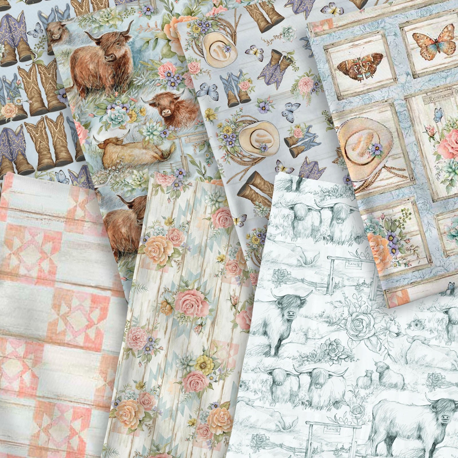 You will receive seven fat quarters from the Highland Ranch collection. Each measure approximately 18 x 21 inches.