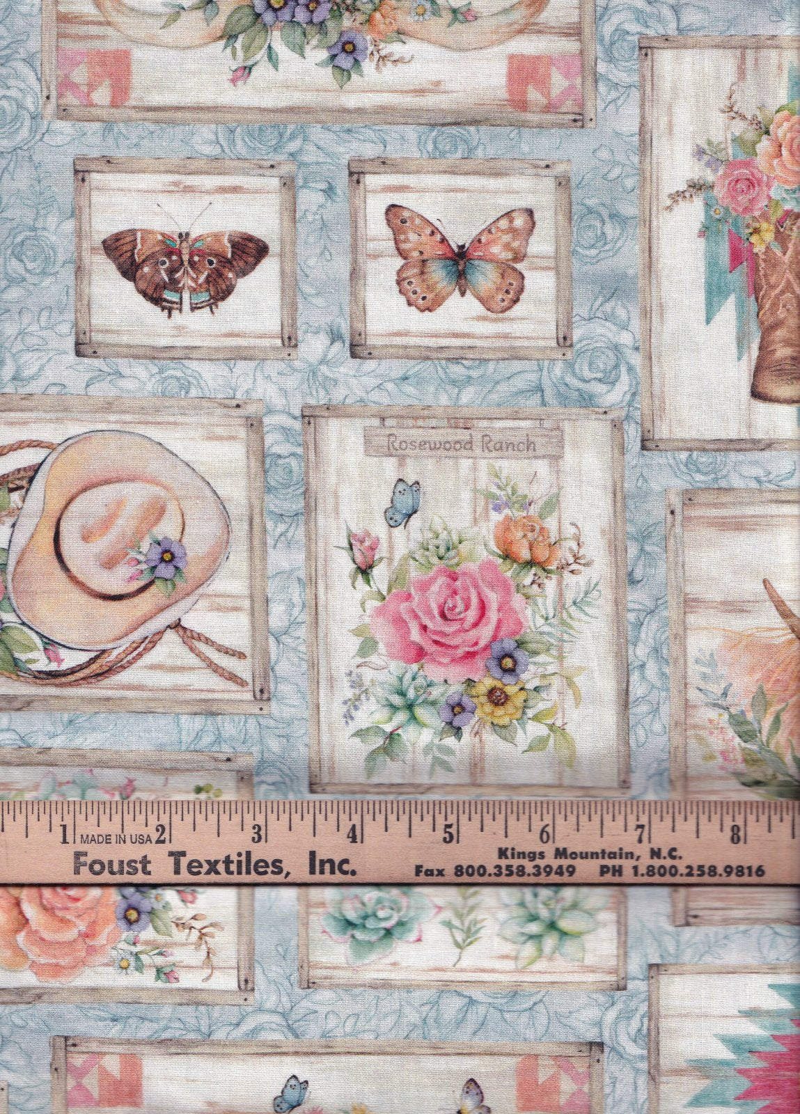 Bring the charm of the rustic West into your creative projects with this delightful Highland Ranch patch fabric, featuring a whimsical patchwork of framed illustrations on a soft light blue background. Adorned with a shaggy highland cow crowned in blooming florals, vibrant roses and succulents in shades of pink, orange, and yellow, alongside cowboy hats, weathered boots, butterflies, and Southwestern geometric patterns, this design captures a perfect blend of bohemian flair and country elegance. The intricate details, like wooden sign motifs with "Highland Ranch" script and delicate floral wreaths, add a vintage, hand-painted texture that's ideal for quilting, apparel, home decor, or upholstery accents. Crafted from premium material, its versatile appeal makes it a must-have for DIY enthusiasts looking to infuse their sewing or crafting endeavors with a touch of Western whimsy and natural beauty. Sold by the yard, multiple yards will be continuous cut.