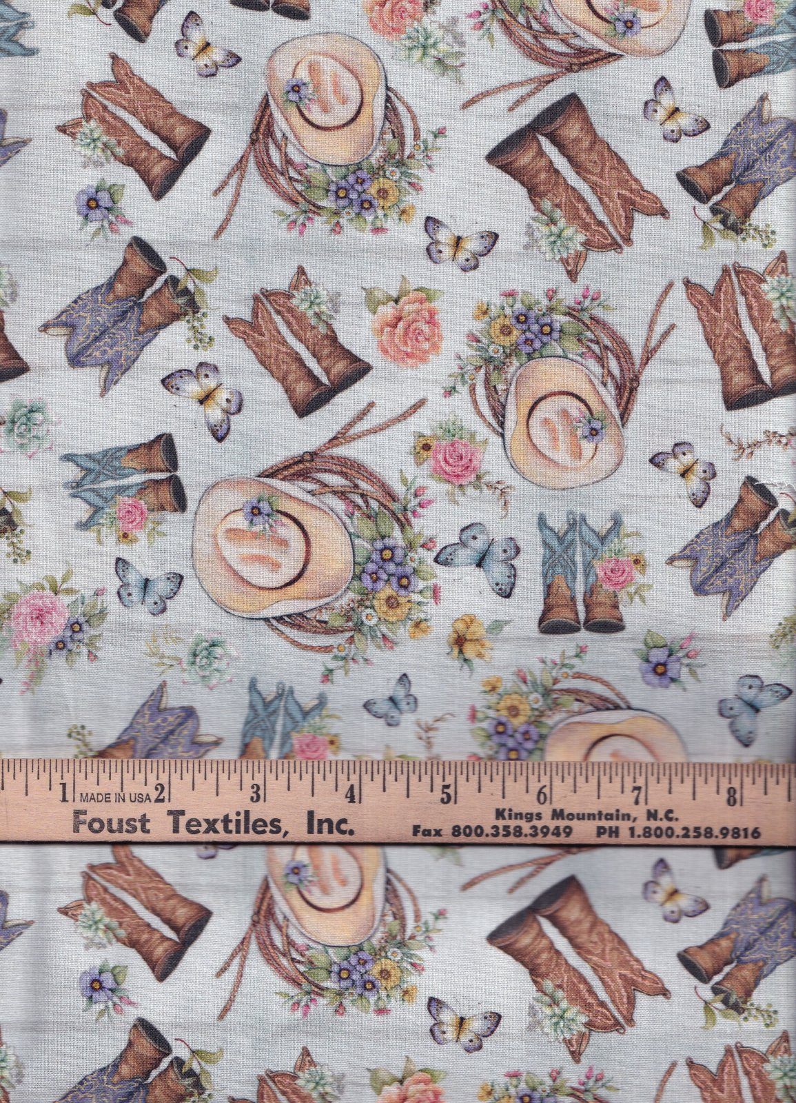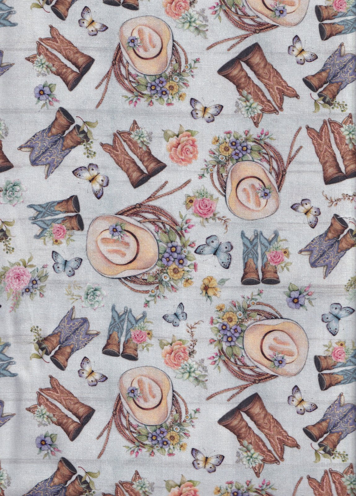 Dive into the whimsical charm of this delightful fabric featuring a tossed pattern of ornate cowboy boots in shades of soft blue and warm brown, artfully adorned with blooming roses, delicate butterflies, and succulent accents in pastel hues of pink, orange, and purple against a serene light blue background. The intricate western-inspired design blends rustic ranch vibes with floral elegance, creating a versatile textile perfect for crafting unique quilts, apparel, home decor accents, or upholstery projects that evoke a cozy, countryside feel. Ideal for DIY enthusiasts, this soft woven cotton fabric offers a smooth texture and vibrant print that brings a touch of bohemian flair to any creation, making it a standout choice for personalized gifts or seasonal crafts that celebrate nature and adventure. Sold by the yard, multiple yards will be continuous cut.