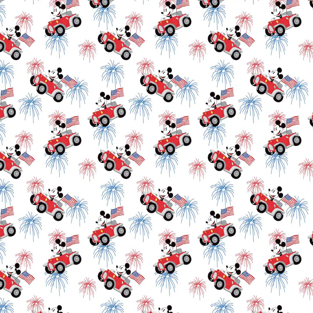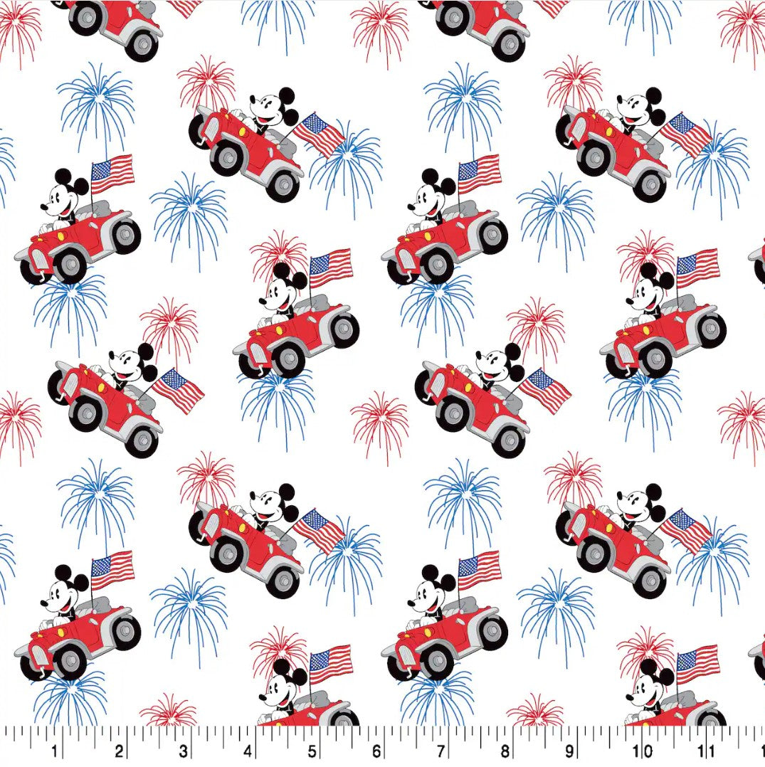 Mickey Mouse rides around in a vintage red car waving a USA Flag with fireworks on a white background. This 100% quilt cotton fabric by the yard is perfect for your next patriotic quilt, sewing, or craft project. Price is per yard, multiple yards will be continuous cut.