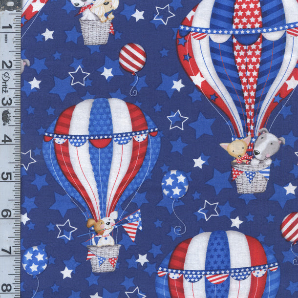 This vibrant fabric features an allover design of adorable puppies enjoying a whimsical adventure in hot air balloons. The balloons are decorated with patriotic red, white, and blue patterns, set against a deep navy blue background adorned with stars and small balloons. The playful scene captures the essence of fun and freedom, making it perfect for a variety of creative projects from children's clothing to festive home decor.